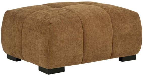 Ottoman in amber fabric showcases sculptural volume and plush vertical grid tufting