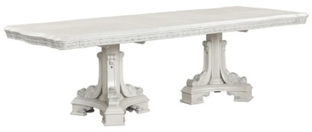 The Stella Mia Dining Table is a traditional-style piece designed to bring elegance to your dining area. Crafted from solid rubberwood and oak with ash burl veneer, it features an ivory finish that complements its ornate details.Read More