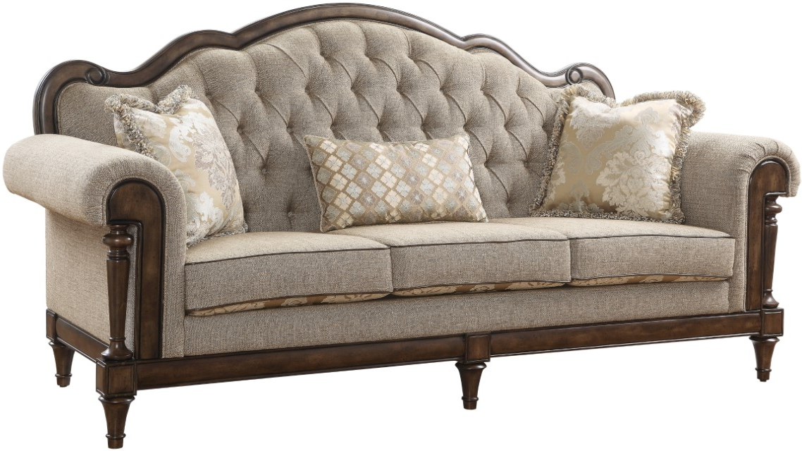 The show-wood frame features white oak veneer with a brown finish that complements the fabric cover. The dramatic camelback profile is enhanced by the rolled arms and turned pilaster fronts.
