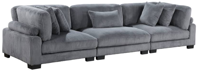 Configurable to your available space, the Traverse Collection allows for the addition and detachment of pieces for a customized seating experience. The sofa configuration consists of two corner units paired with a centrally placed armless chair. The plush gray corduroy fabric upholstery creates a plush expanse for a soft touch experience.Read More