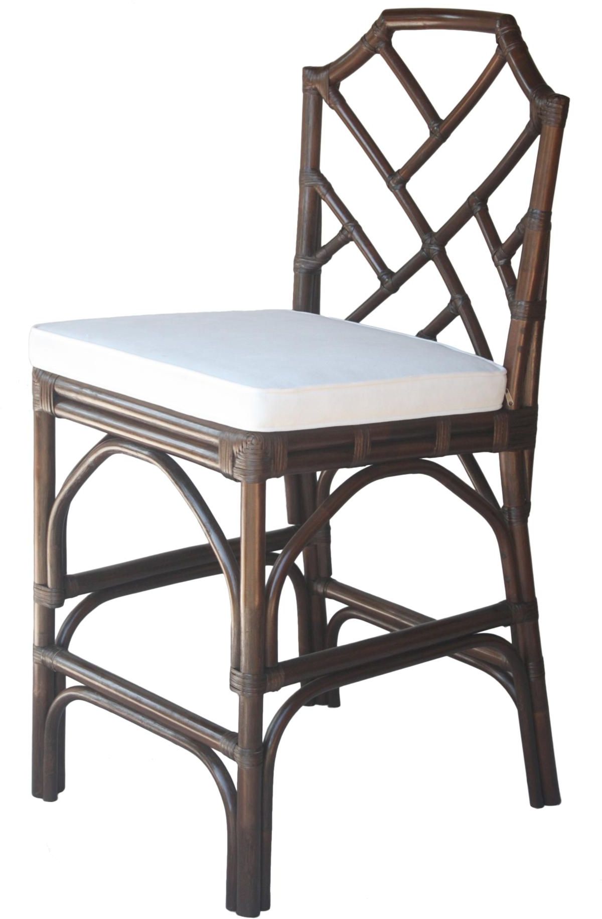 The Kara rattan collection includes this 27" seat height counter stool. A reproduction from the original master cabinet maker featuring Chinese Chippendale style design inspired by pagoda motifs with visually appealing diagonal lines. Fully assembled, available in Paloma Brown, White, or Gray.