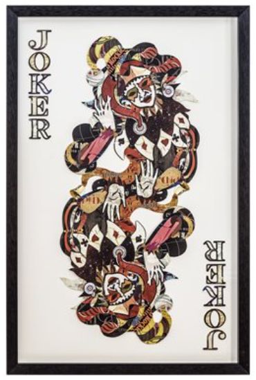 Rounding out the face cards, this 3D collage is finished with a glass and black frame. Different prints in black, gold, red, and white are layered to create this artwork that can be used alone or with other pieces to style any room.Read More